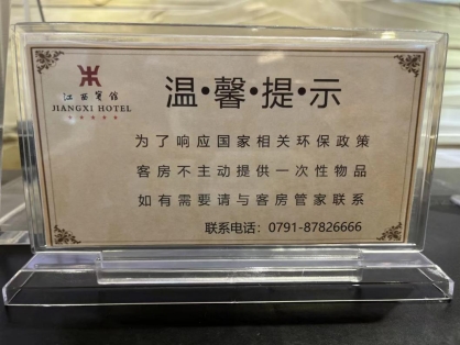 江西賓館等多家星級酒店通過在前臺和客房擺放提示牌,以及在大堂明顯位置擺放宣傳立牌的方式,加強對不提供一次性用品的宣傳,進一步宣傳普及綠色環保文明旅游知識。玉泉島等酒店充分利用LED 顯示屏、宣傳櫥窗等向顧客播放文明旅游宣傳標語,倡導文明就餐,引導顧客使用公勺公筷,落實光盤行動,以實際行動踐行工作,促進酒店的綠色環保發展,讓市民游客以及酒店內工作人員建立文明旅游觀念,進一步提高文明素養,共同打造文明和諧的旅游環境。