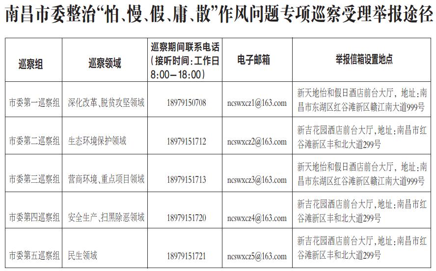 根據(jù)南昌市委統(tǒng)一部署,2018年6月13日至7月12日,市委5個(gè)巡察組對(duì)深化改革、生態(tài)環(huán)境保護(hù)、脫貧攻堅(jiān)、營商環(huán)境、重點(diǎn)項(xiàng)目、安全生產(chǎn)、掃黑除惡、民生等8個(gè)重點(diǎn)領(lǐng)域作風(fēng)建設(shè)情況開展專項(xiàng)巡察,了解上述領(lǐng)域涉及的黨組織和黨員干部是否存在不敢擔(dān)當(dāng)“怕作為”、效率低下“慢作為”、應(yīng)付了事“假作為”、庸碌無為“不作為”、紀(jì)律松散“亂作為”等突出問題。