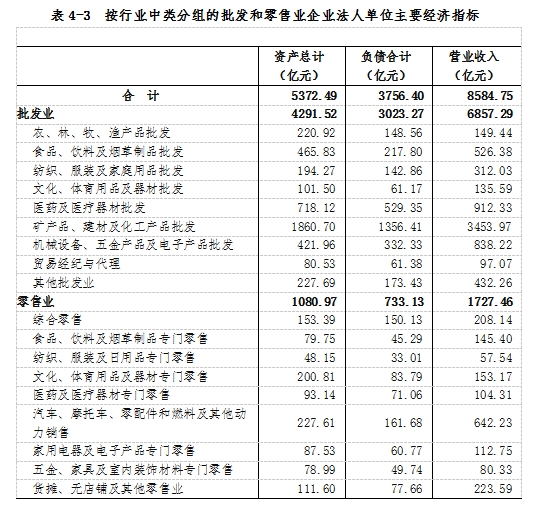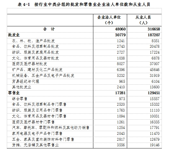 在批發(fā)和零售業(yè)企業(yè)法人單位中,批發(fā)業(yè)占64.0%,零售業(yè)占36.0%。在批發(fā)和零售業(yè)企業(yè)法人單位從業(yè)人員中,批發(fā)業(yè)占59.1%,零售業(yè)占40.9%(詳見表4-1)。