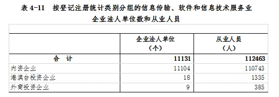 在信息傳輸、軟件和信息技術(shù)服務(wù)業(yè)企業(yè)法人單位從業(yè)人員中,內(nèi)資企業(yè)占98.5%,港澳臺投資企業(yè)占1.2%,外商投資企業(yè)占0.3%(詳見表4-11)。