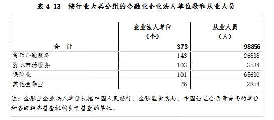 2023年末,全市共有金融業(yè)企業(yè)法人單位373個,從業(yè)人員9.89萬人(詳見表4-13)。