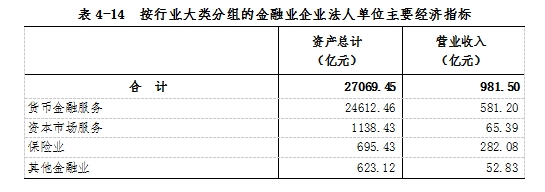 2023年末,金融業(yè)企業(yè)法人單位資產(chǎn)總計27069.45億元,全年實現(xiàn)營業(yè)收入981.50億元(詳見表4-14)。