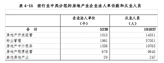 2023年末,全市房地產(chǎn)業(yè)企業(yè)法人單位從業(yè)人員10.10萬人,比2018年末增長48.6%。其中,房地產(chǎn)開發(fā)經(jīng)營企業(yè)1.43萬人,比2018年末下降32.5%;物業(yè)管理企業(yè)5.71萬人,房地產(chǎn)中介服務(wù)企業(yè)1.98萬人,分別比2018年末增長76.8%和131.5%(詳見表4-15)。