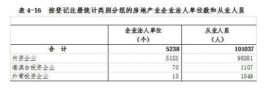 在房地產(chǎn)業(yè)企業(yè)法人單位從業(yè)人員中,內(nèi)資企業(yè)占97.4%,港澳臺投資企業(yè)占1.1%,外商投資企業(yè)占1.5%(詳見表4-16)。