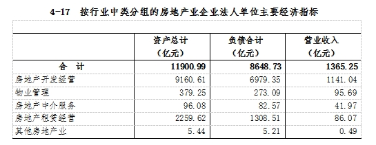 2023年末,全市房地產(chǎn)業(yè)企業(yè)法人單位資產(chǎn)總計11900.99 億元,比2018年末增長20.4%。其中,房地產(chǎn)開發(fā)經(jīng)營企業(yè)9160.61億元,物業(yè)管理企業(yè)379.25億元,房地產(chǎn)中介服務(wù)企業(yè)96.08億元,分別比2018年末增長3.6%、74.1%和243.8%。房地產(chǎn)業(yè)企業(yè)法人單位負債合計8648.73億元,比2018年末增長18.8%。