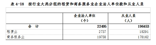 在租賃和商務(wù)服務(wù)業(yè)企業(yè)法人單位中,內(nèi)資企業(yè)占99.8%,港澳臺投資企業(yè)、外商投資企業(yè)和其他統(tǒng)計類別合計占0.2%。