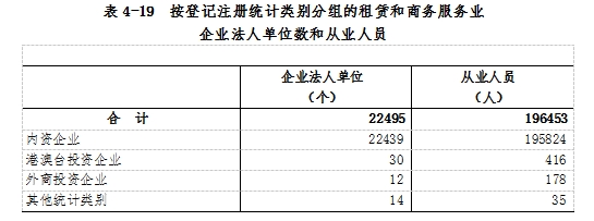 在租賃和商務(wù)服務(wù)業(yè)企業(yè)法人單位從業(yè)人員中,內(nèi)資企業(yè)占99.7%,港澳臺投資企業(yè)占0.2%,外商投資企業(yè)占0.1%(詳見表4-19)。