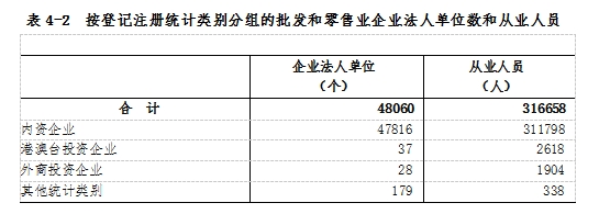 在批發(fā)和零售業(yè)企業(yè)法人單位從業(yè)人員中,內(nèi)資企業(yè)占98.5%,港澳臺投資企業(yè)占0.8%,外商投資企業(yè)占0.6%(詳見表4-2)。
