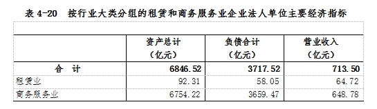 2023年末,租賃和商務(wù)服務(wù)業(yè)企業(yè)法人單位資產(chǎn)總計6846.52億元,比2018年末增長118.3%。其中,租賃業(yè)企業(yè)法人單位資產(chǎn)總計92.31億元,商務(wù)服務(wù)業(yè)企業(yè)法人單位資產(chǎn)總計6754.22億元,分別比2018年末增長195.9%和117.5%。租賃和商務(wù)服務(wù)業(yè)企業(yè)法人單位負債合計3717.52億元,比2018年末增長134.4%。