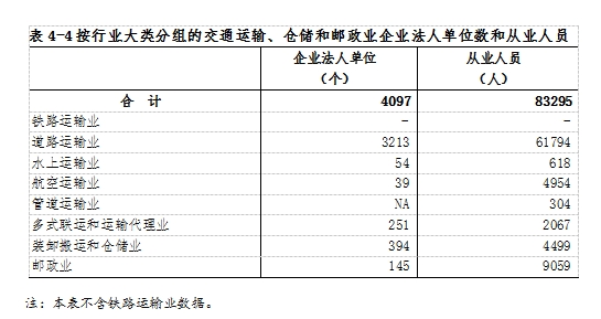 2023年末,全市共有交通運輸、倉儲和郵政業(yè)企業(yè)法人單位4097個,從業(yè)人員8.33萬人,分別比2018年末增長146.8%和17.9%(詳見表4-4)。