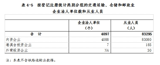 在交通運輸、倉儲和郵政業(yè)企業(yè)法人單位從業(yè)人員中,內(nèi)資企業(yè)占99.7%,港澳臺投資企業(yè)和外商投資企業(yè)合計占0.3%(詳見表4-5)。