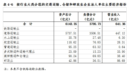 2023年末,交通運輸、倉儲和郵政業(yè)企業(yè)法人單位資產(chǎn)總計6143.35億元,比2018年末增長42.4%;負債合計3795.73億元,比2018年末增長56.1%。