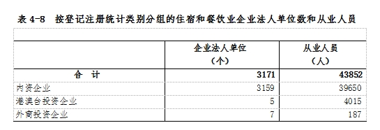 在住宿和餐飲業(yè)企業(yè)法人單位中,內(nèi)資企業(yè)占99.6%,港澳臺投資企業(yè)占0.2%,外商投資企業(yè)占0.2%。