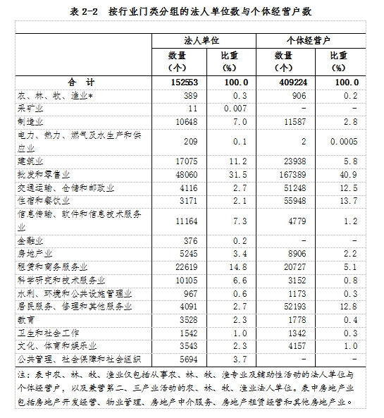 在第二產業和第三產業法人單位中,位居前三位的行業是:批發和零售業4.81萬個,占31.5%;租賃和商務服務業2.26萬個,占14.8%;建筑業1.71萬個,占11.2%。在個體經營戶中,位居前三位的行業是:批發和零售業16.74萬個,占40.9%;住宿和餐飲業5.59萬個,占13.7%;居民服務、修理和其他服務業5.22萬個,占12.8%(詳見表2-2)。