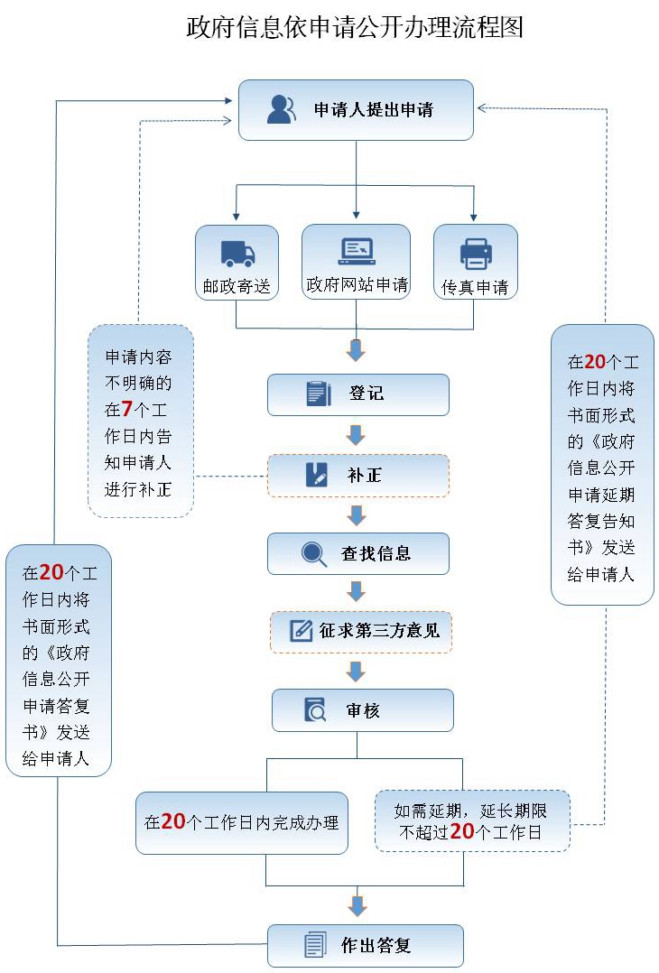 1、市民宗局在收到申請(qǐng)后,對(duì)申請(qǐng)要件是否完備進(jìn)行審查,對(duì)政府信息公開(kāi)申請(qǐng)內(nèi)容不明確的,自收到申請(qǐng)之日起7個(gè)工作日內(nèi)一次性告知申請(qǐng)人作出補(bǔ)正,說(shuō)明需要補(bǔ)正的事項(xiàng)和合理的補(bǔ)正期限。答復(fù)期限自行政機(jī)關(guān)收到補(bǔ)正的申請(qǐng)之日起計(jì)算。申請(qǐng)人無(wú)正當(dāng)理由逾期不補(bǔ)正的,視為放棄申請(qǐng),行政機(jī)關(guān)不再處理該政府信息公開(kāi)申請(qǐng)。